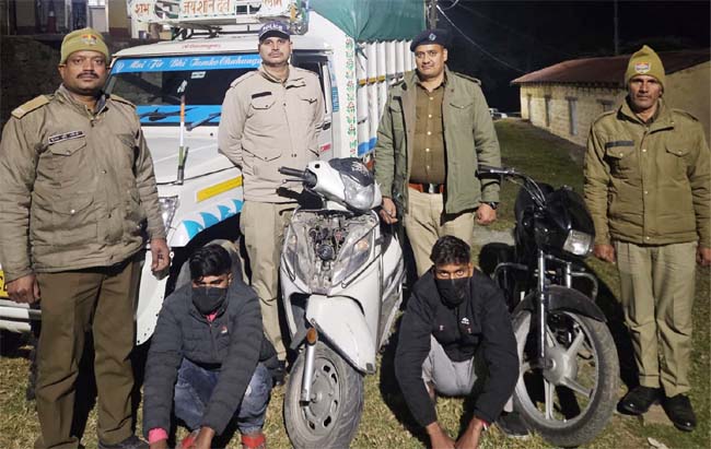नैनीताल। वाहन चोरी की बढ़ती घटनाओं के बीच भवाली पुलिस को बड़ी कामयाबी मिली है। पुलिस ने लंबे समय से हो रही वाहन चोरी की घटनाओं का खुलासा करते हुए दो शातिर चोरों को गिरफ्तार किया है। आरोपियों के कब्जे से एक स्कूटी और एक मोटरसाइकिल बरामद की गई है।